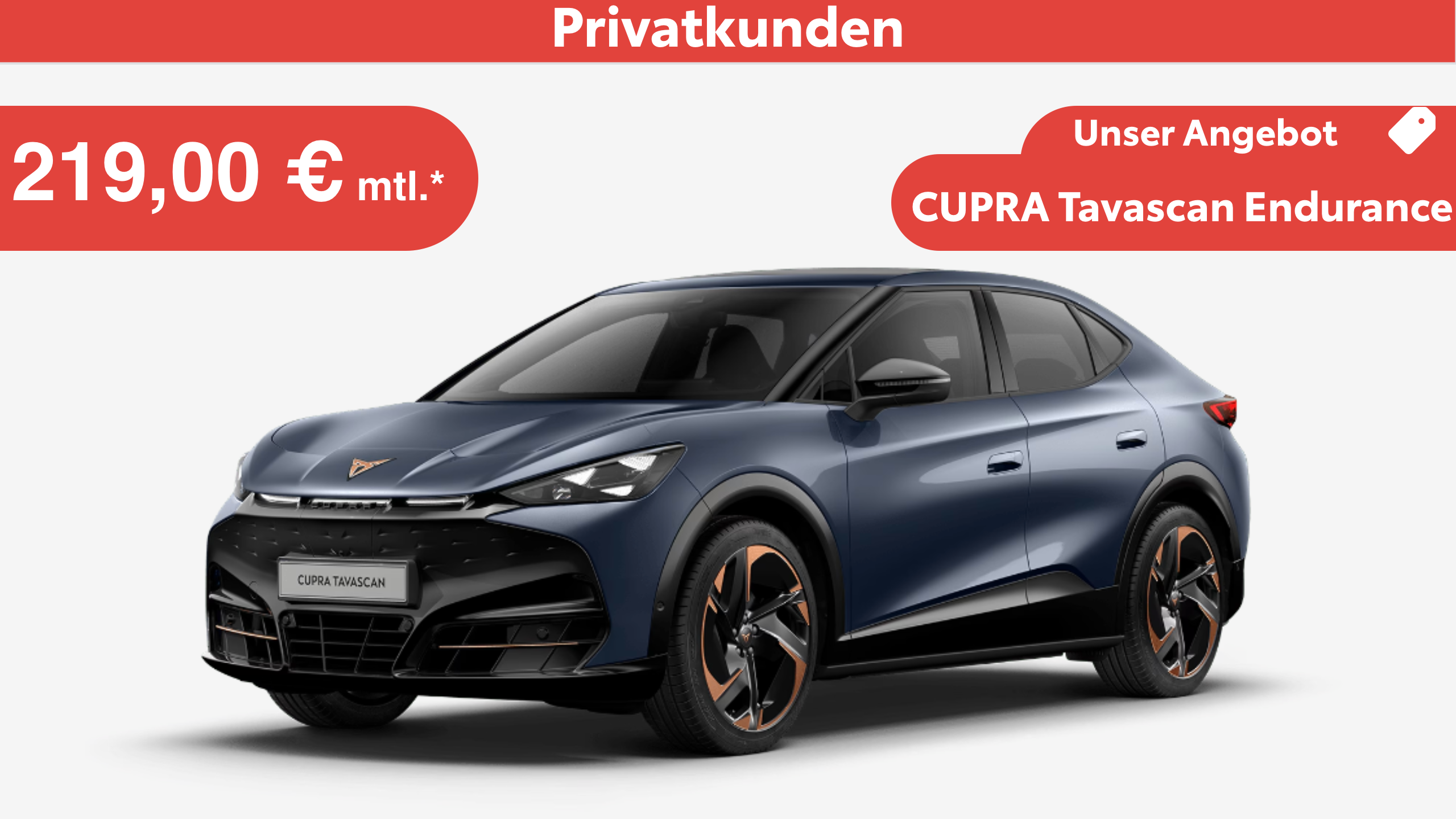 ***CUPRA TRIBE Bonus entspricht einer von der CUPRA SEAT Deutschland GmbH gewährten Aktionsprämie, die beim Barverkauf bei Rechnungsstellung in Abzug gebracht und beim Leasing bereits bei der Leasingratenberechnung berücksichtigt wird. Der CUPRA TRIBE Bonus beträgt 5.000,00 € (brutto) für den CUPRA Tavascan. Berechtigt zum Erhalt der Aktionsprämie sind ausschließlich Privatkunden und gewerbliche Einzelabnehmer. Gültig bis 31.03.2026.
